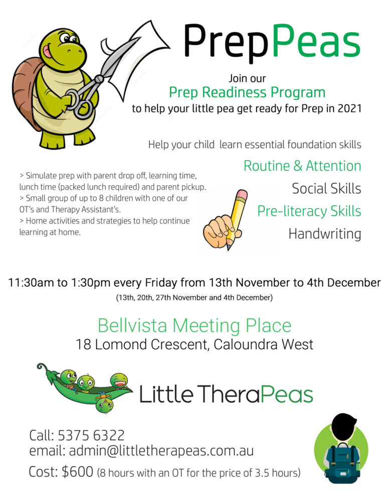 The Prep readiness group is run across 4 weeks, 1 day per week. We typically run this group over the June-July school holidays and in November or December to help identify the areas that children need support with and address them prior to starting their first year of school the following year.  The group is targeted at helping your child be ready for prep by giving them the essential foundation skills needed. They will learn the foundational skills of how to make new friends, writing (through pre-writing shapes, letter awareness and pencil grasp), reading (through decoding words, identifying rhyming words and beginning/ending sounds of words and letters), how to sit and listen in the classroom, how to be independent during lunch breaks, cutting, colouring and pasting and socially appropriate behaviours within the school environment.